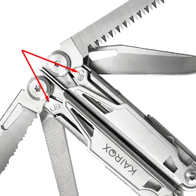 Мультитулы KaiRox спроектированы так, чтобы инструмент был надёжно зафиксирован во время работы и не складывался случайно. Для этого в наших мультитулах используются два типа замков: