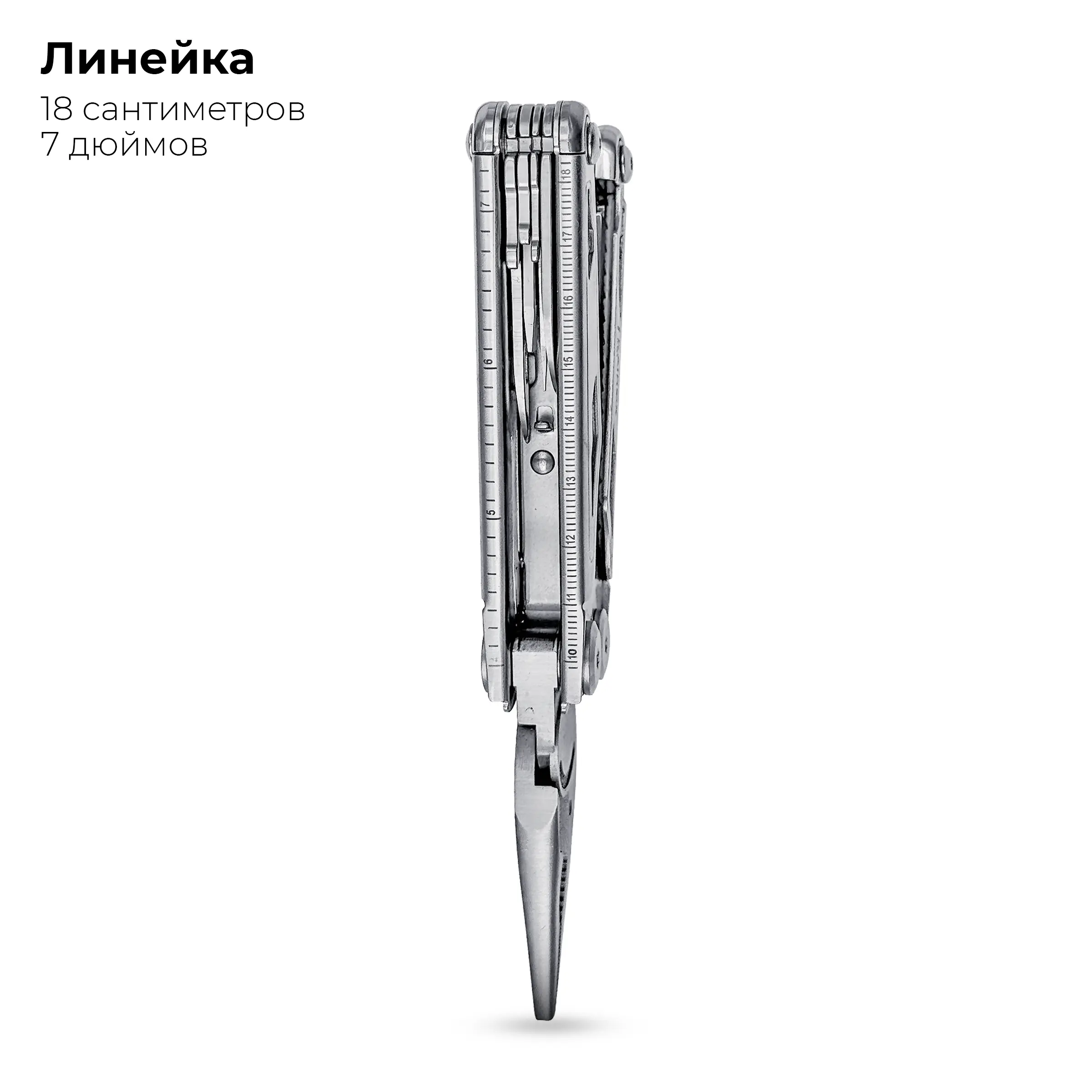 • 17 встроенных инструментов — всё, что нужно каждый день: пассатижи, ножи, пила, ножницы, отвертки, шило, открывалки и многое другое.