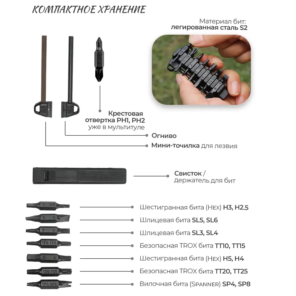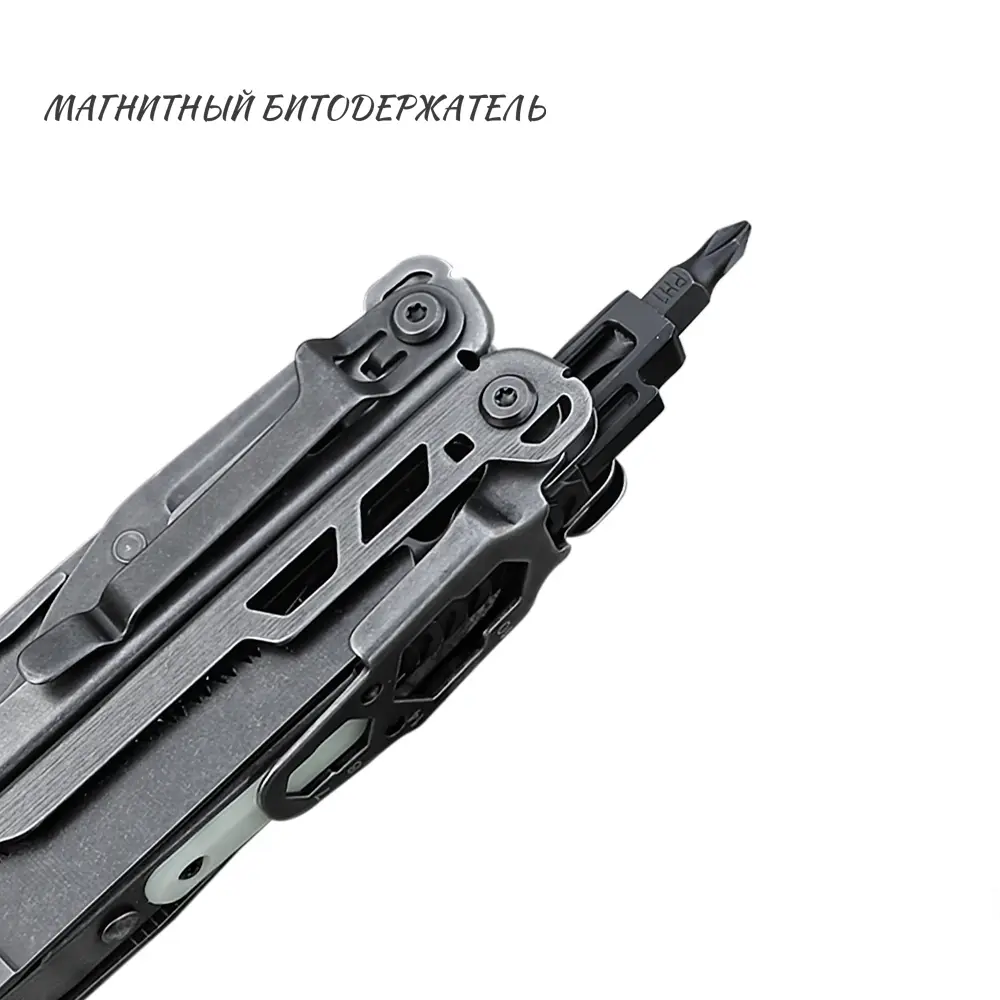 Комплектные биты фиксируются за счёт встроенного магнита в битодержателе мультитула. Он обеспечивает базовую фиксацию, однако в некоторых ситуациях биты могут держаться чуть свободнее — как в самом битодержателе, так и в пластиковом держателе для хранения.