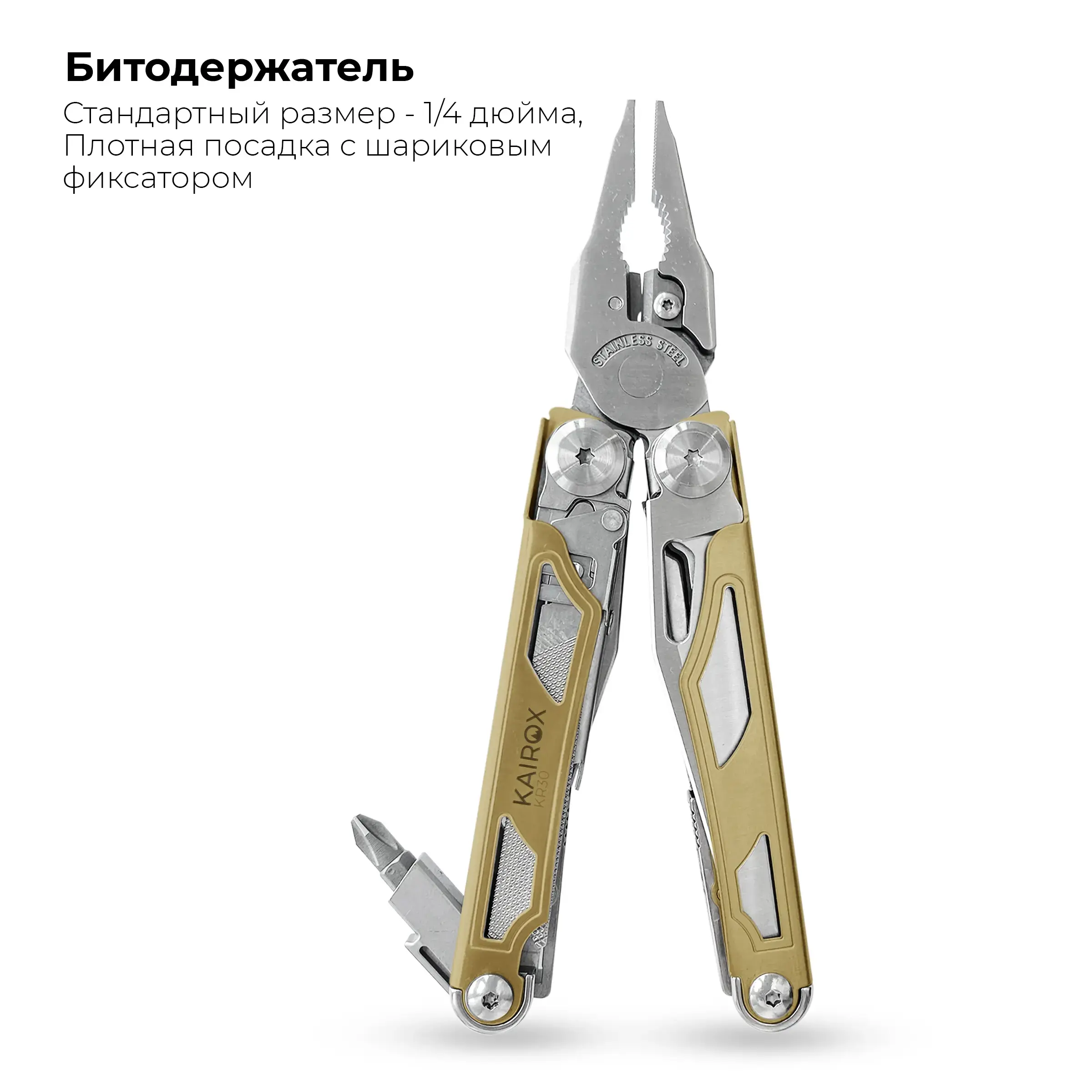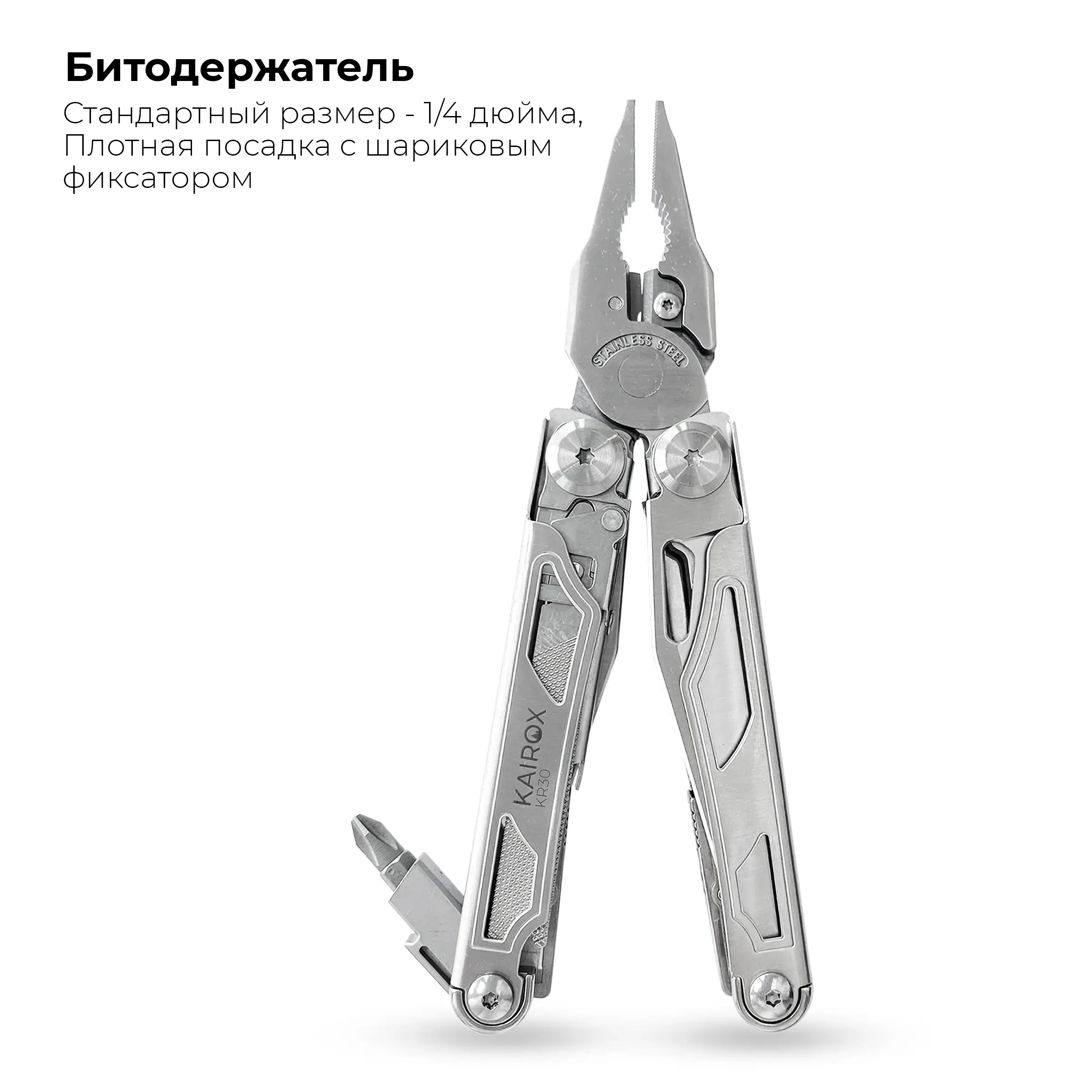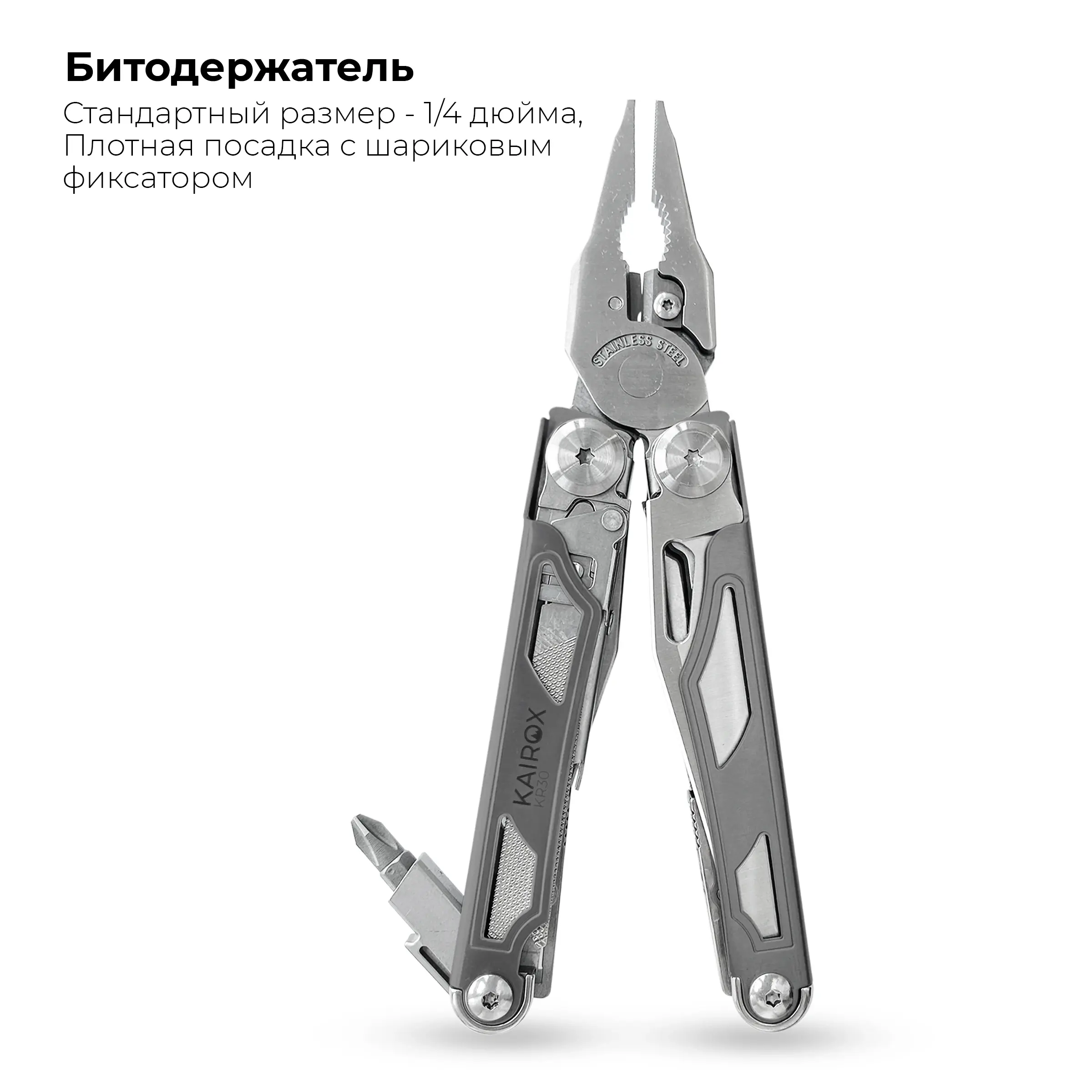KaiRox KR30 — это универсальный мультитул, созданный для тех, кто ценит надёжность, широкий функционал и уверенность в любой ситуации. Он сочетает в себе 18 инструментов и 8 двусторонних бит (16 насадок), удобную конструкцию и прочные материалы, позволяя заменить целый набор оборудования одним компактным устройством.