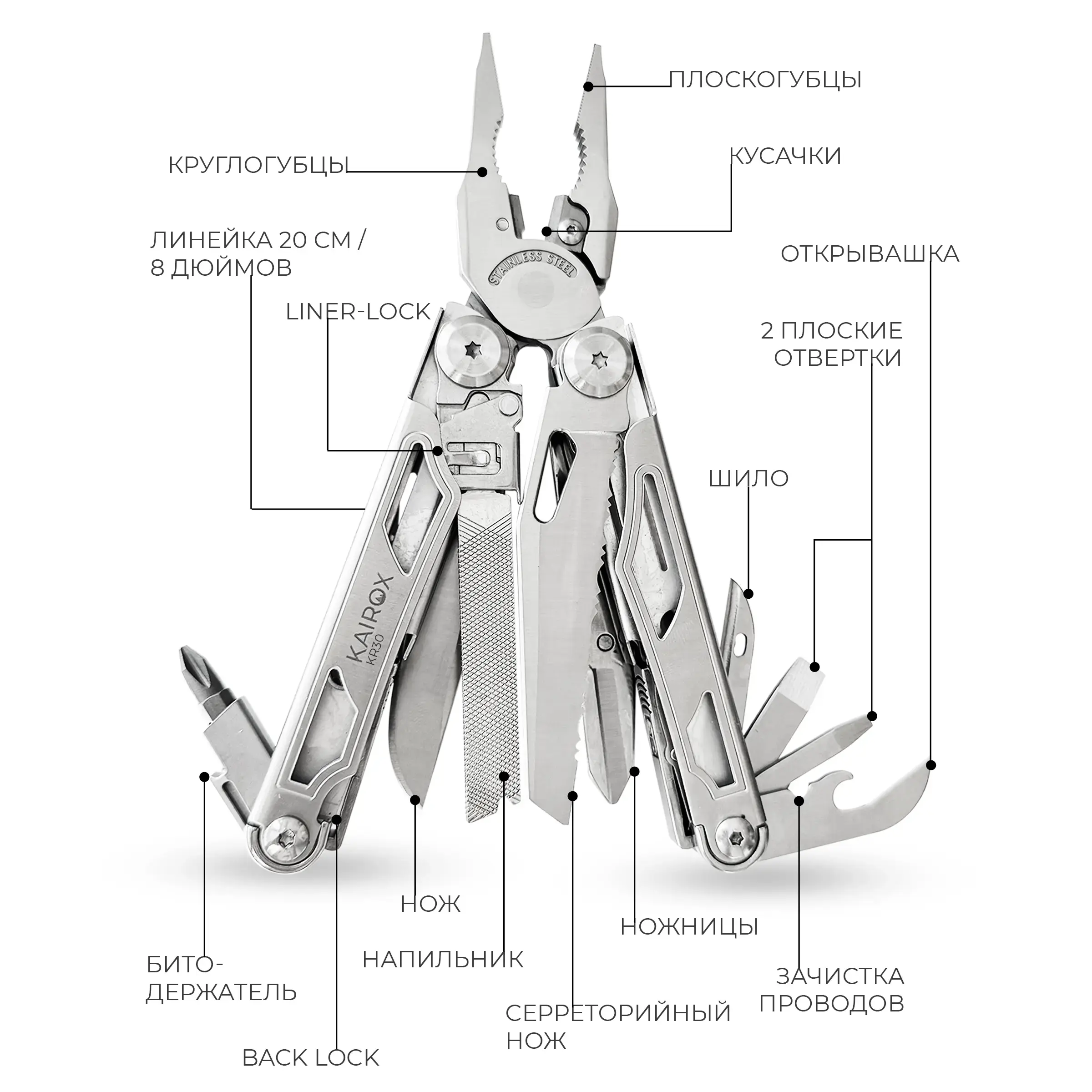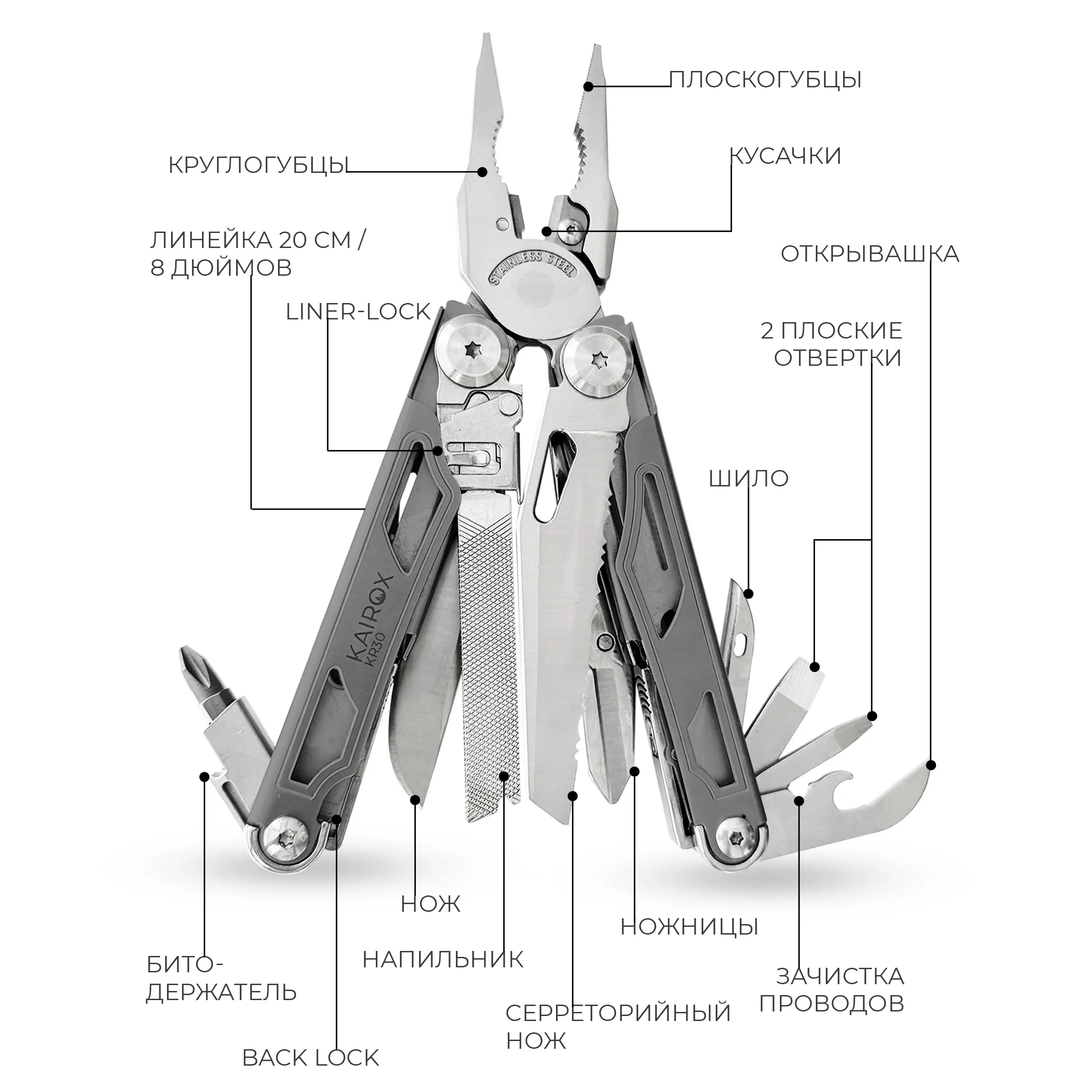 KR30 объединяет в себе большой набор инструментов, который охватывает большинство повседневных, бытовых и походных задач.