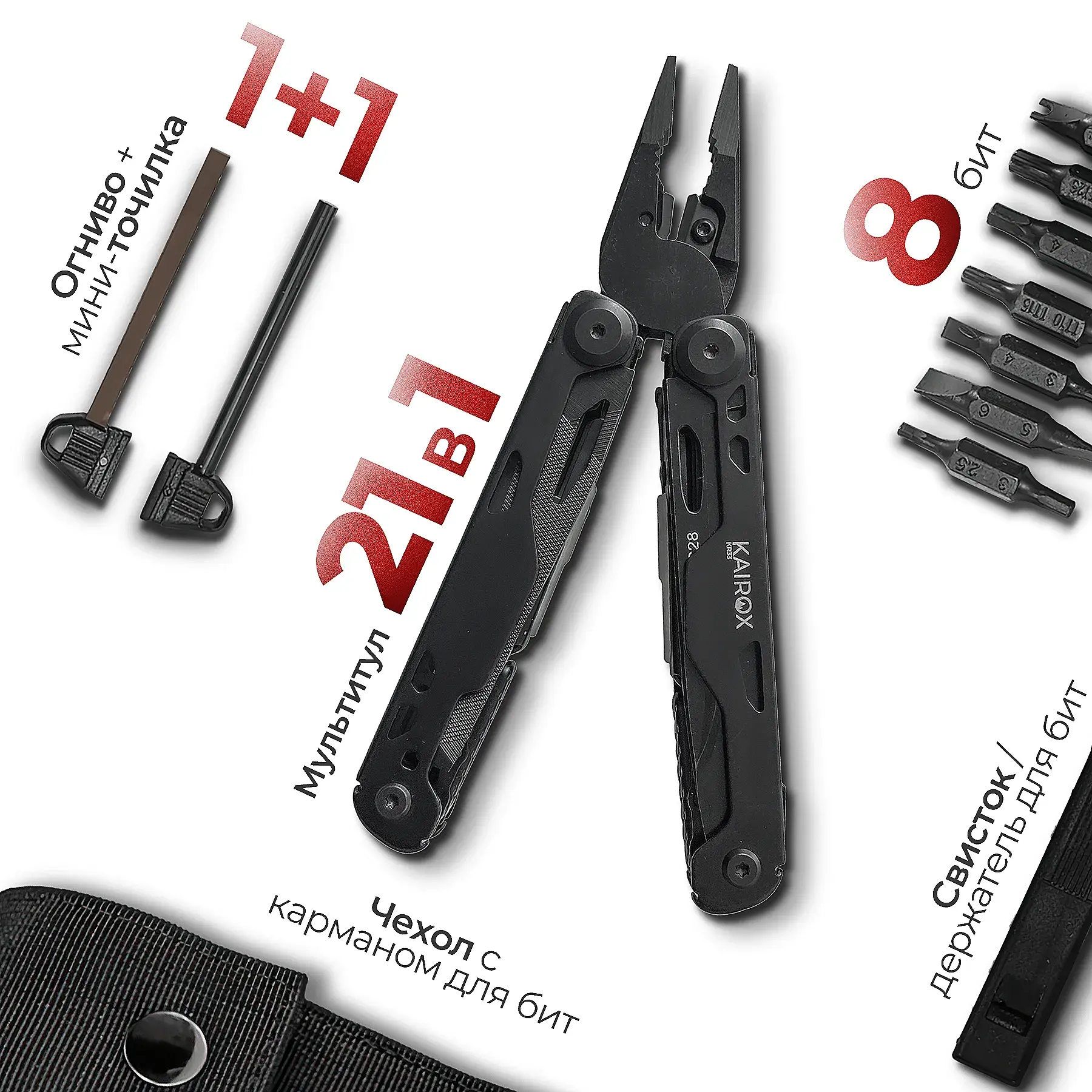 KaiRox KR33 создан как полноценный набор инструментов, собранный в одном компактном, прочном и удобном корпусе. Он объединяет 21 функцию, высококачественные материалы и продуманную эргономику — всё, что нужно человеку, который привык быть готовым к любой ситуации.